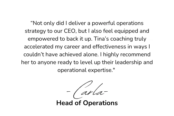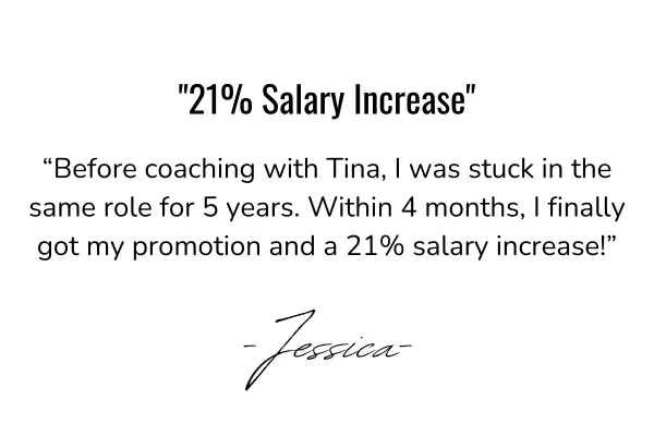 “Before coaching with Tina, I was stuck in the same role for 5 years. Within 4 months, I finally got my promotion and a 21% salary increase!”— Jessica