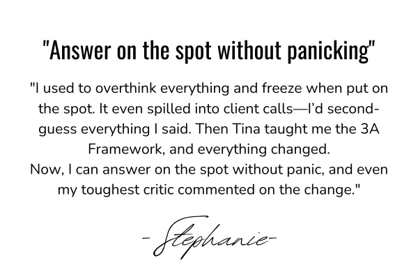 “I used to overthink everything and freeze when put on the spot. Then Tina taught me the 3A Framework, and everything changed.”— Stephanie