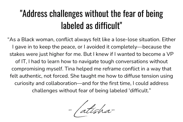 “Tina taught me how to navigate conflict without compromising myself. Now I can speak up without fear of being labeled ‘difficult.’”— Latisha